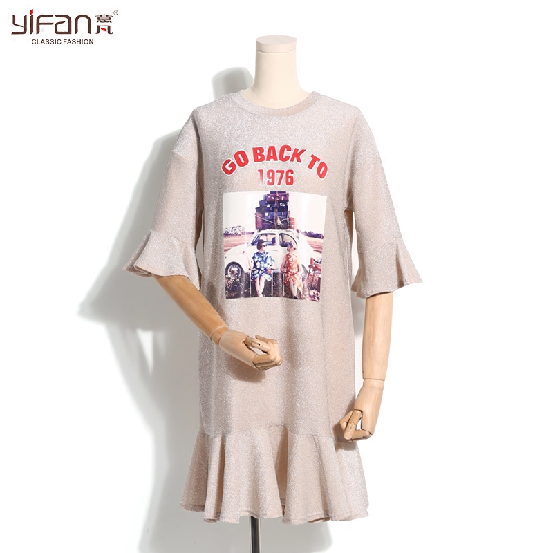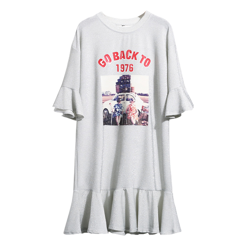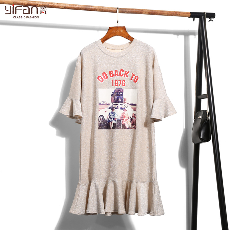 夏季中長款喇叭袖T恤裙女裝韓版寬松七分袖荷葉邊印花體恤裙