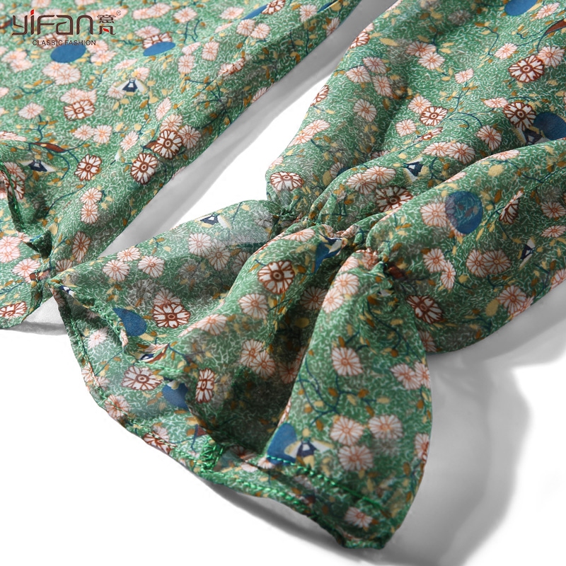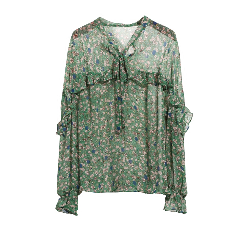 春夏新款女裝系帶蝴蝶結碎花木耳拼接上衣荷葉邊雪紡衫長袖
