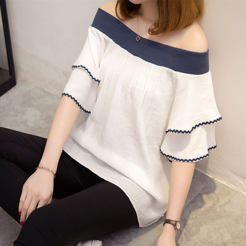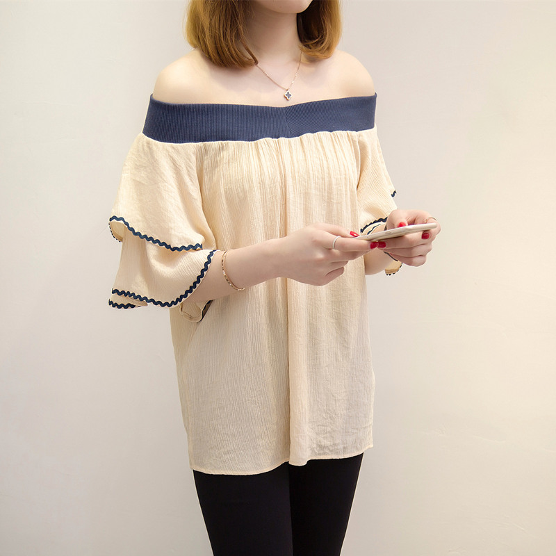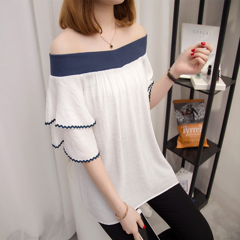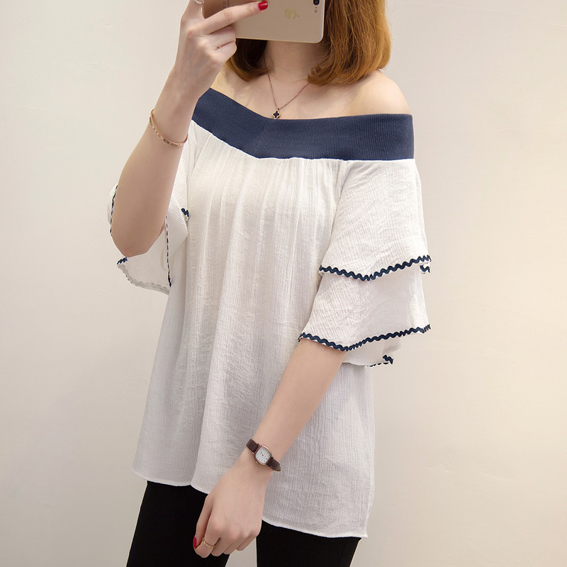 短袖一字領上衣女夏新款露肩雪紡白色t恤女短袖韓版寬松百搭