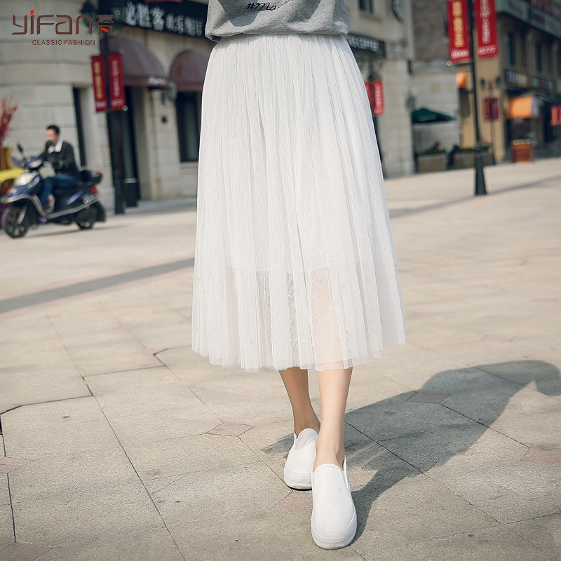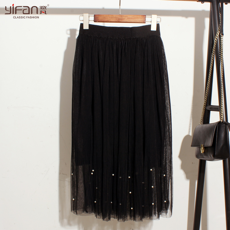 春夏女裝清新松緊腰寬松釘珠紗網中裙純色大裙擺半身裙