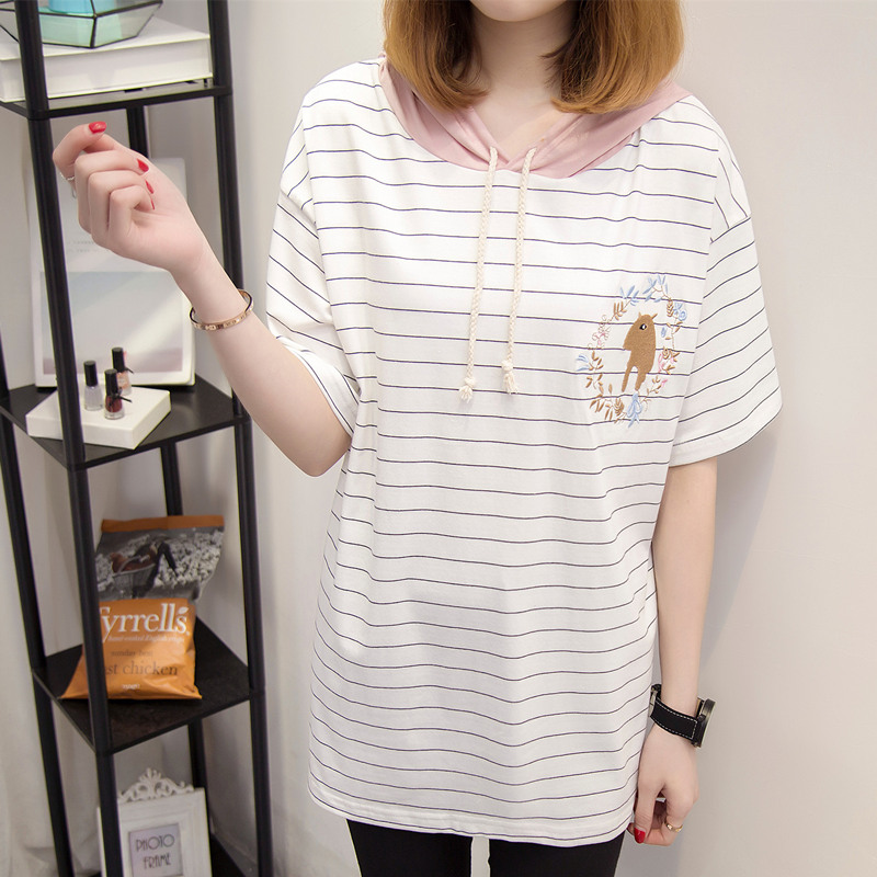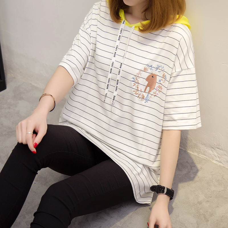 條紋連帽t恤女韓版薄款休閑體恤衫中長款上衣女夏新款女裝潮