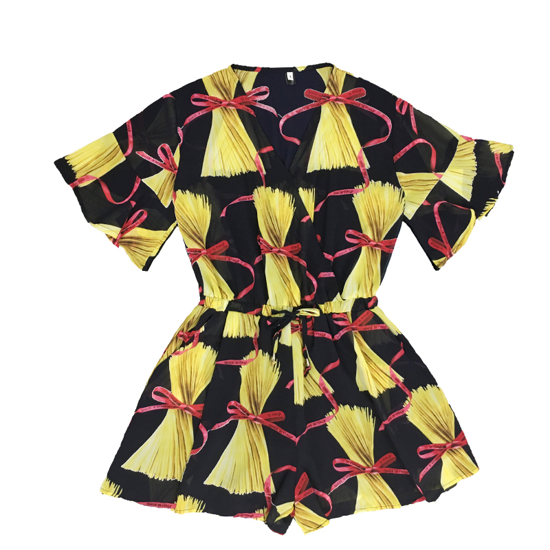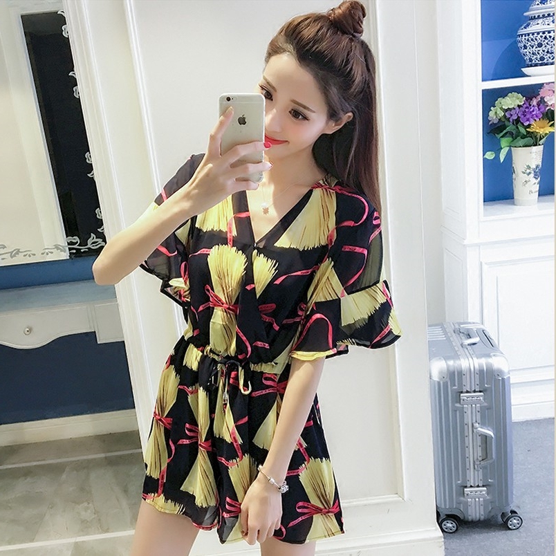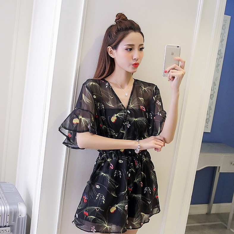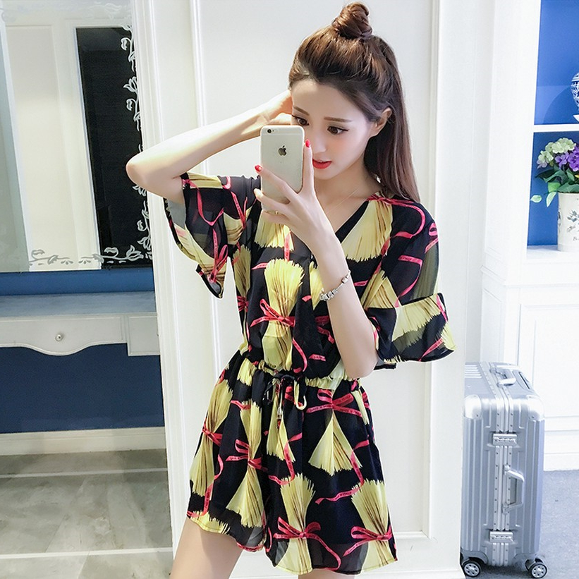 夏季新款寬松V領雪紡連體短褲復古名媛氣質碎花時尚連衣裙女
