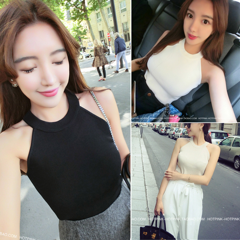 / 春夏韓版新品修身百搭露肩掛脖無袖短款上衣針織衫背心吊帶女