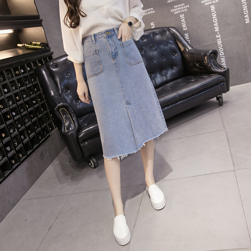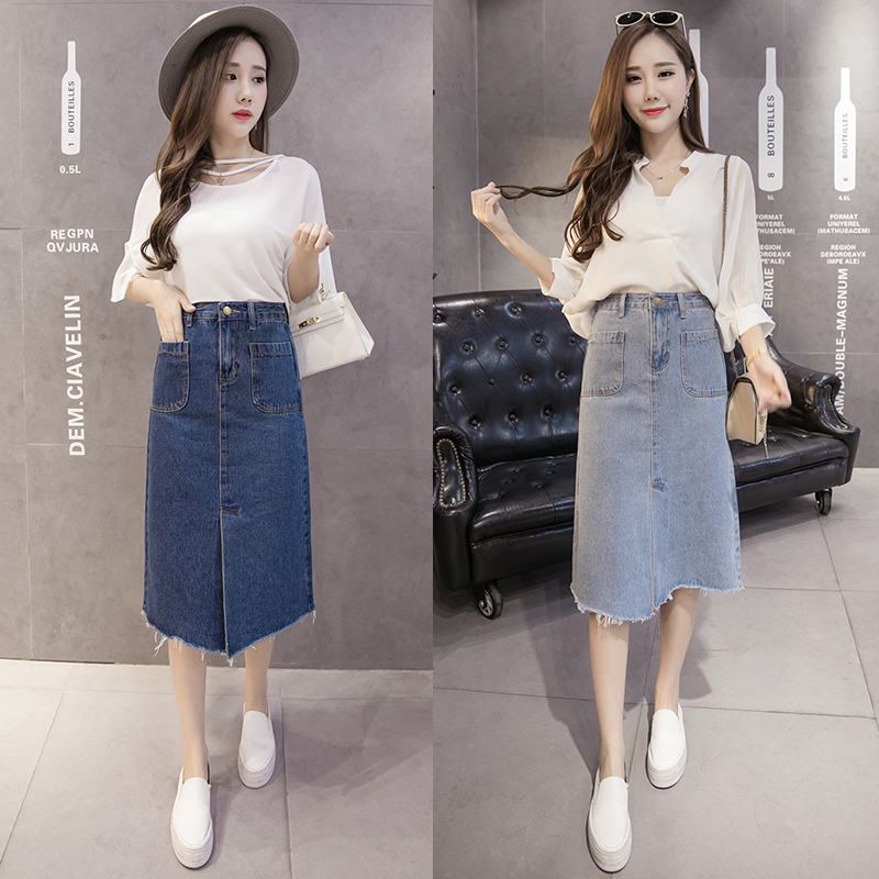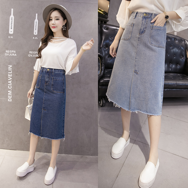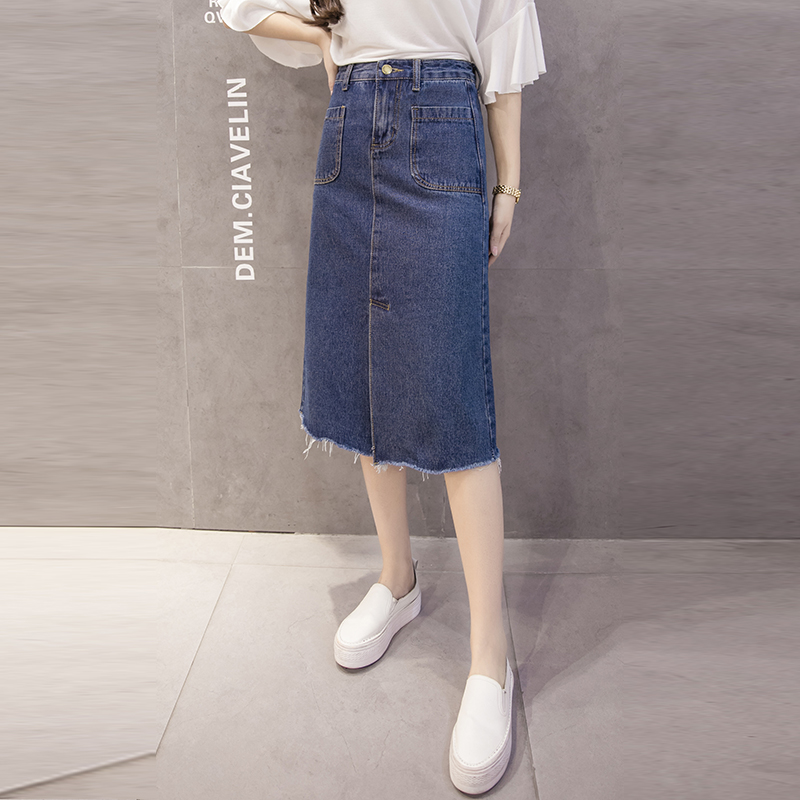春夏牛仔裙中長款長裙毛邊高腰百搭半身裙女單排扣a字包臀裙