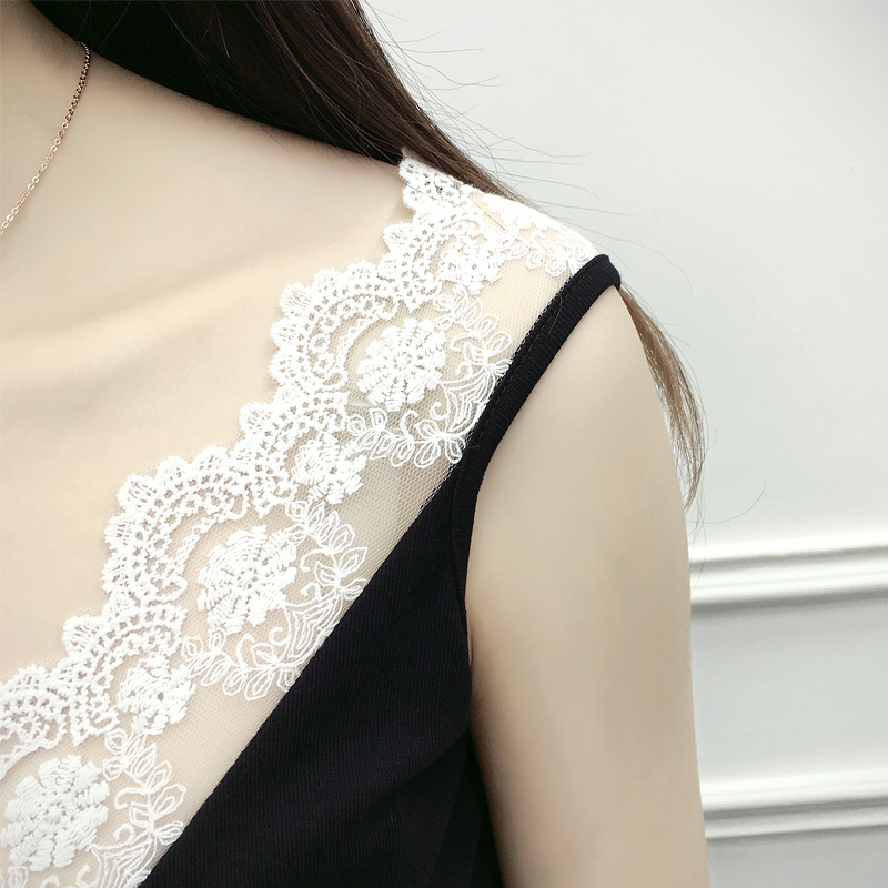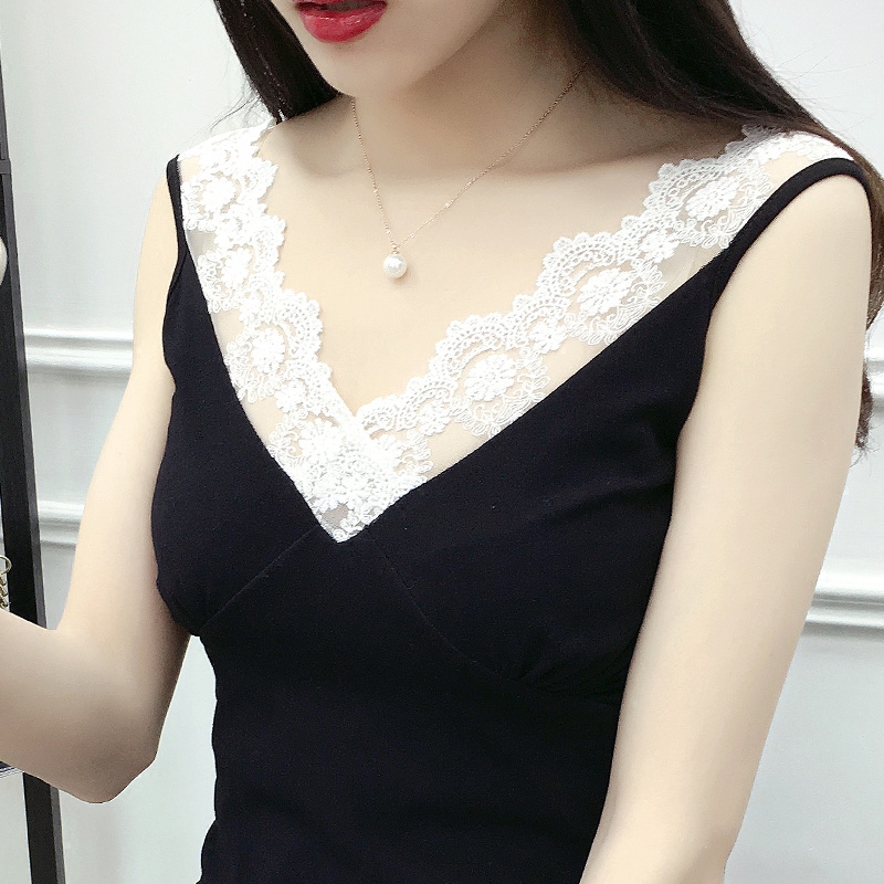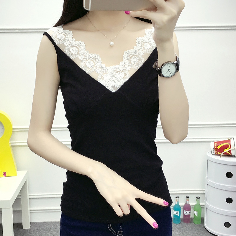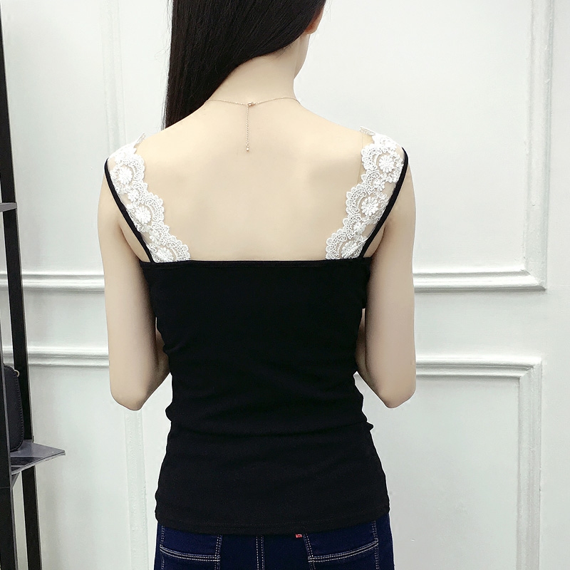 新款大碼顯瘦棉蕾絲拼接V領百搭純色背心女吊帶打底衫外穿
