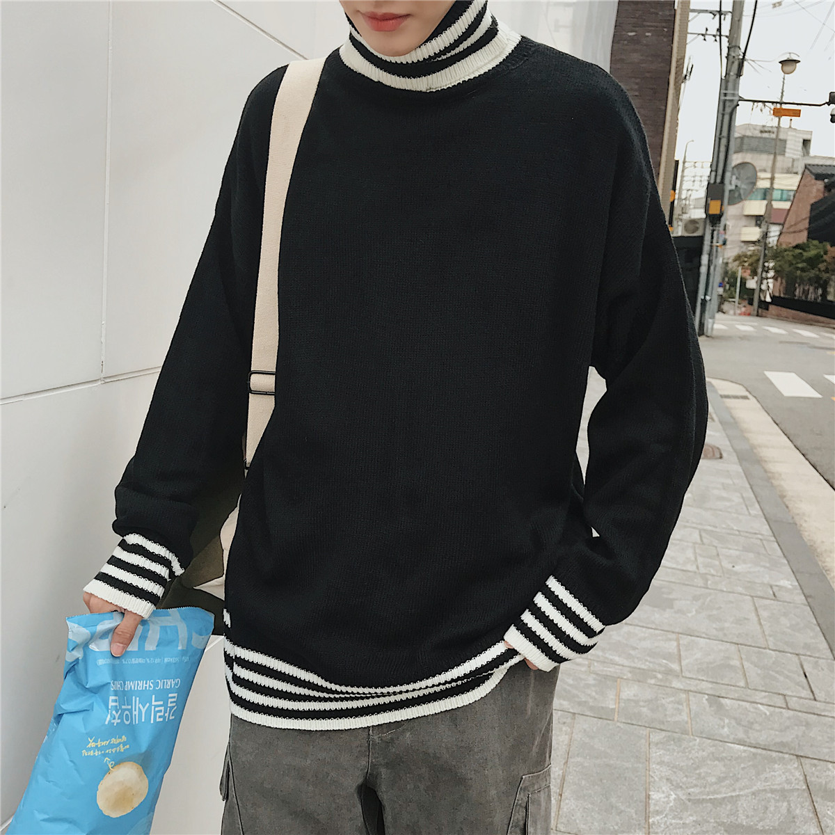 文藝男女店男士條紋毛衣冬季韓版高領精神小伙針織衫秋季潮流外套