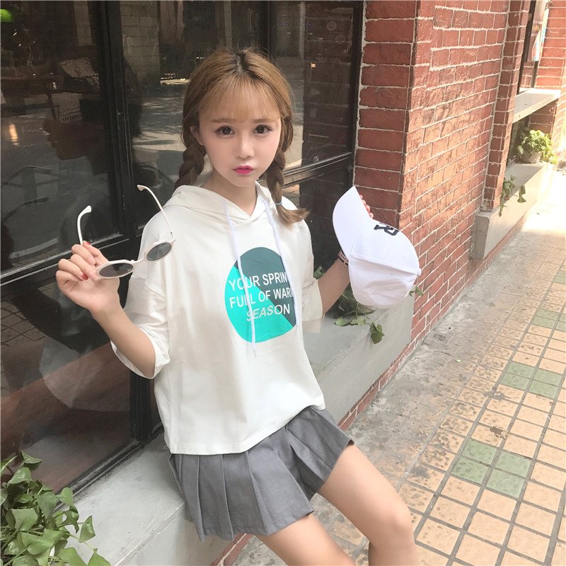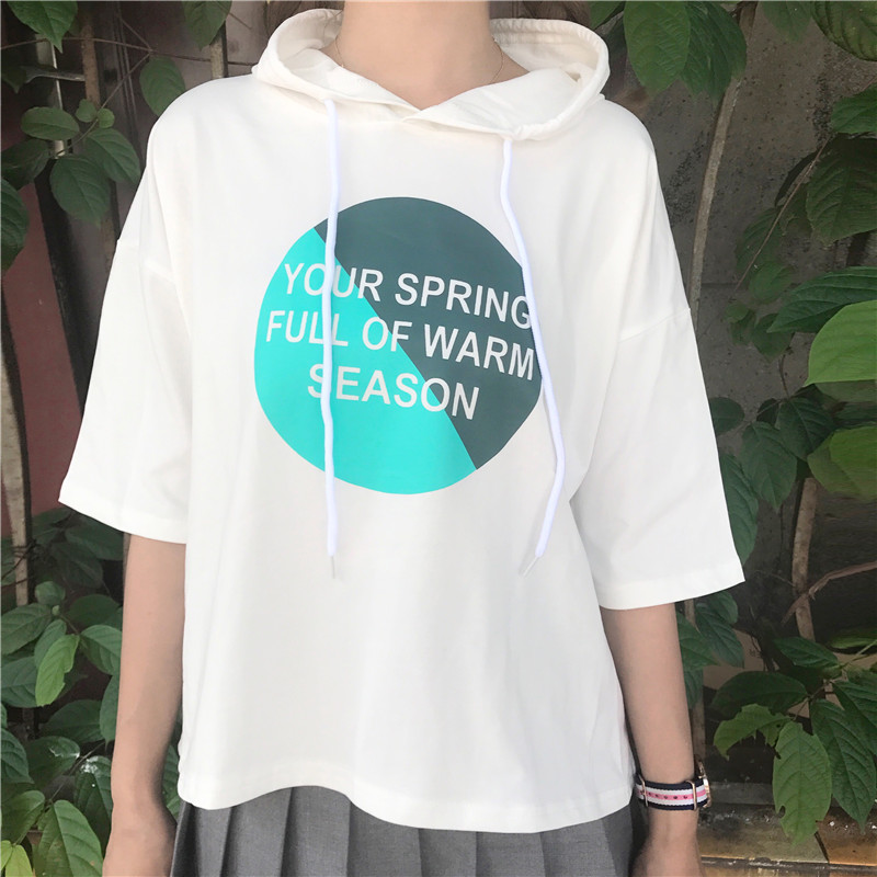 夏季連帽短袖t恤女原宿風bf韓版潮學生寬松中 半袖百搭帶帽衫衛衣