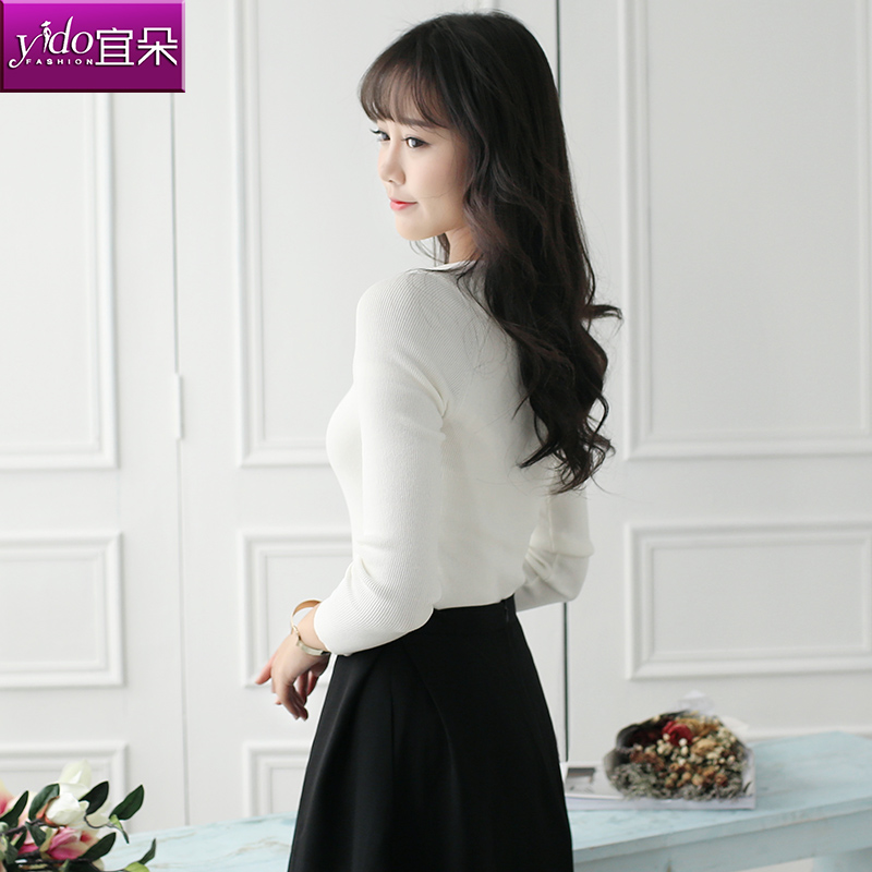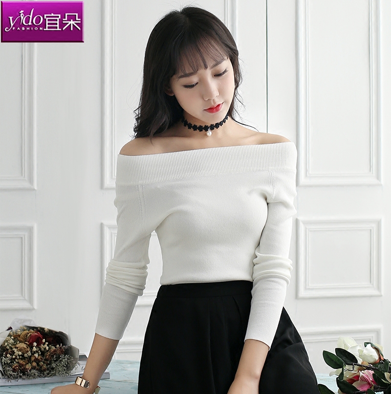 一字領露肩針織打底衫女短款長袖春季顯瘦針織衫女套頭毛衣女修身