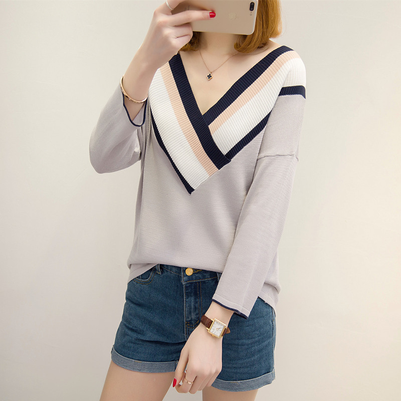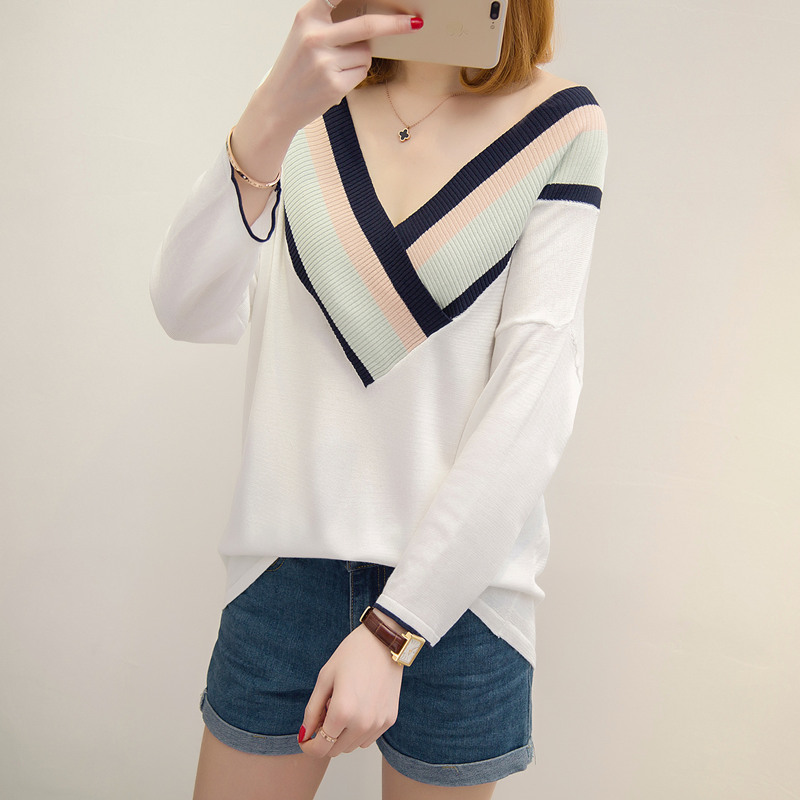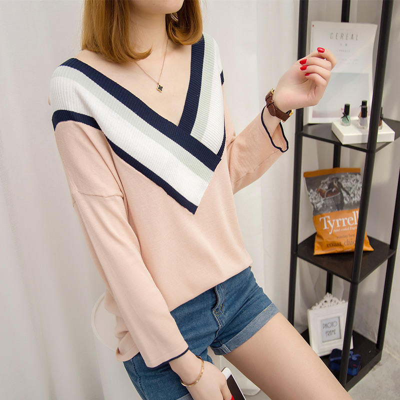 女裝春裝新款女韓版寬松V領針織衫長袖打底衫顯瘦上衣百搭潮
