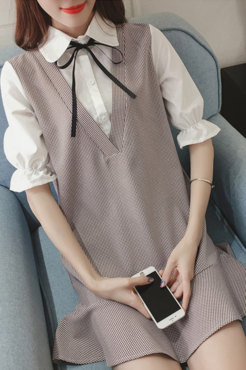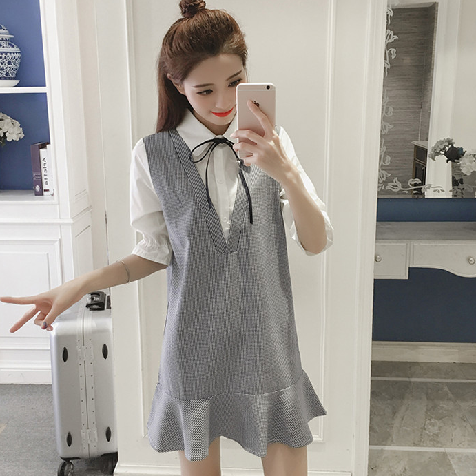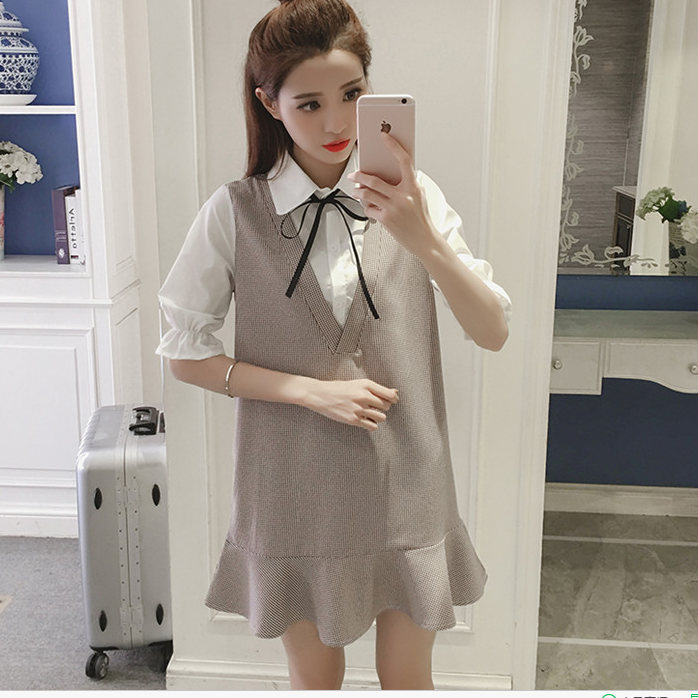 春夏季新款女裝韓版假兩件寬松顯瘦荷葉邊中袖格子襯衫連衣裙