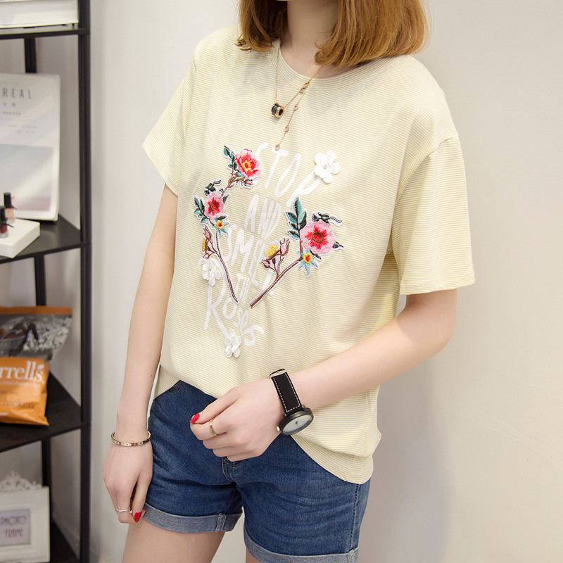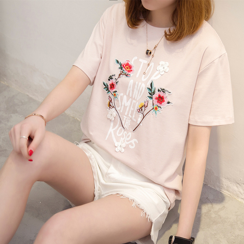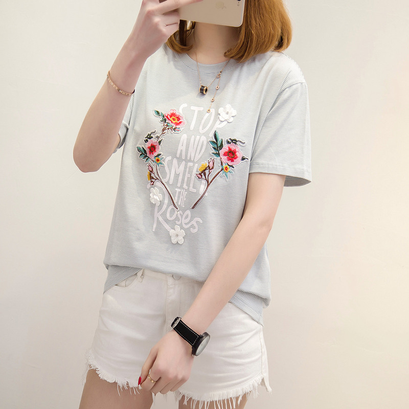 女裝夏裝新款潮立體刺繡花卉t恤女短袖韓版上衣女夏寬松百搭