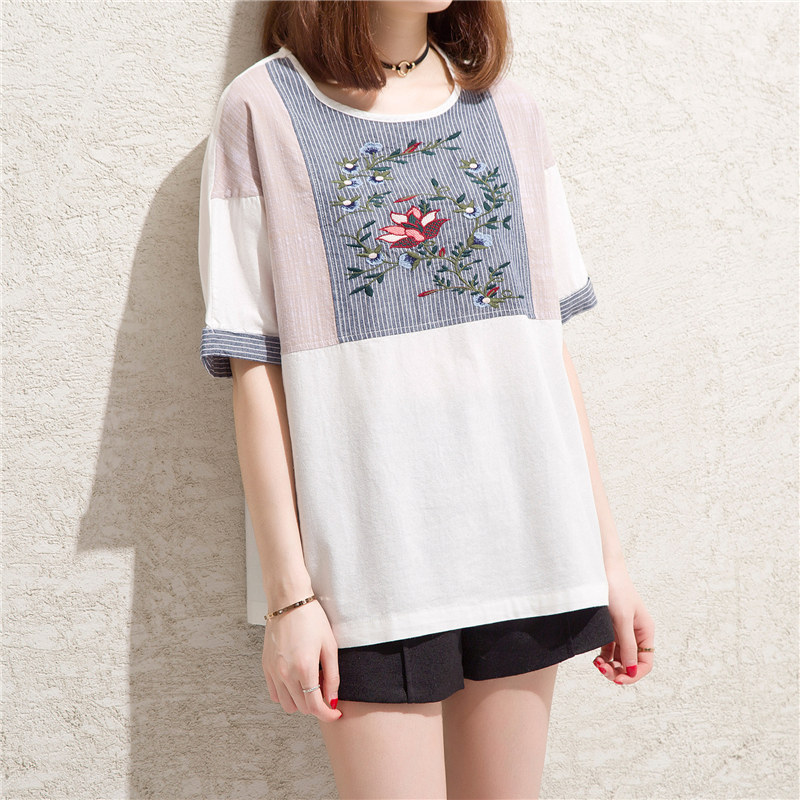 夏裝新款女寬松條紋t恤女白色韓版復古名族風小心機上衣女夏