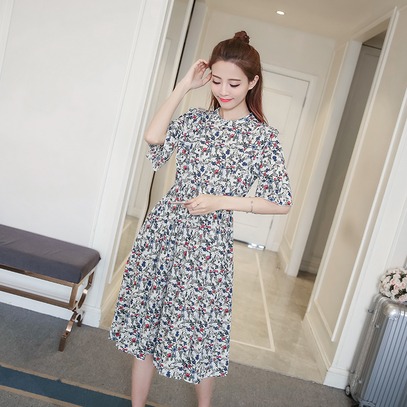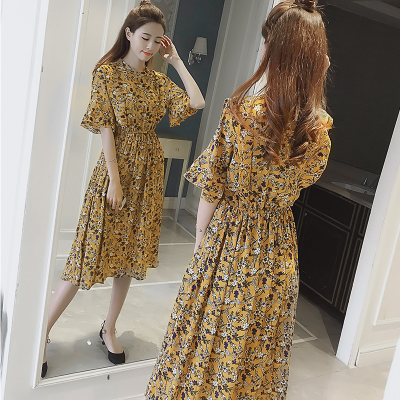 夏季新款女裝復古印花短袖中長款裙子收腰顯瘦碎花雪紡連衣裙