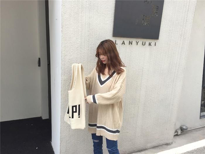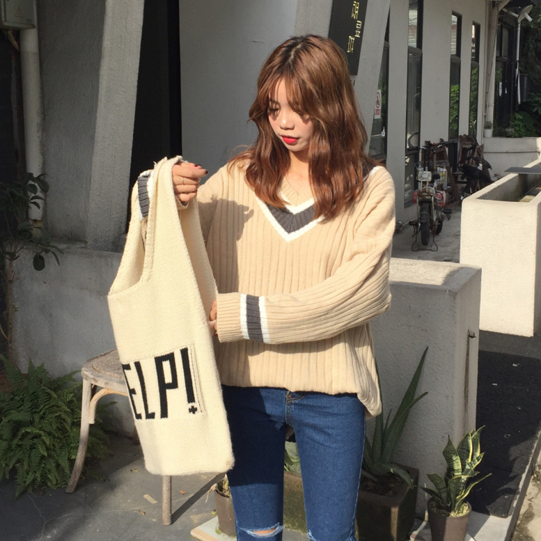 韓版寬松撞色v領女裝毛衣外套新款秋裝大碼套頭長袖針織衫上衣潮