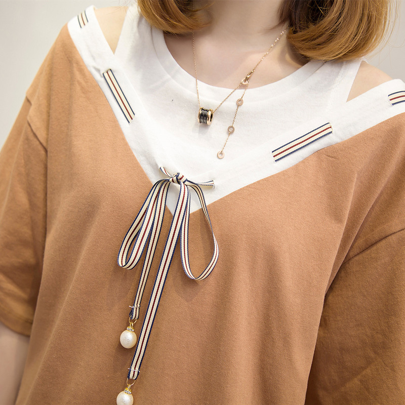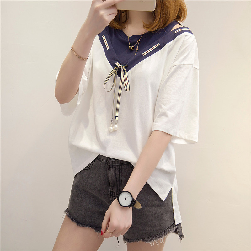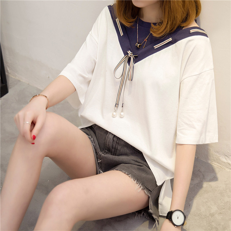 漏肩上衣女學生夏季短袖韓國寬松衣服新款bf港風t恤女小清新