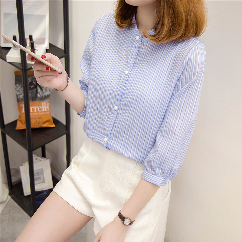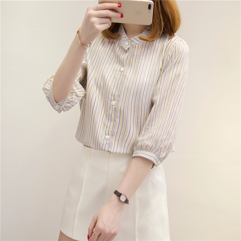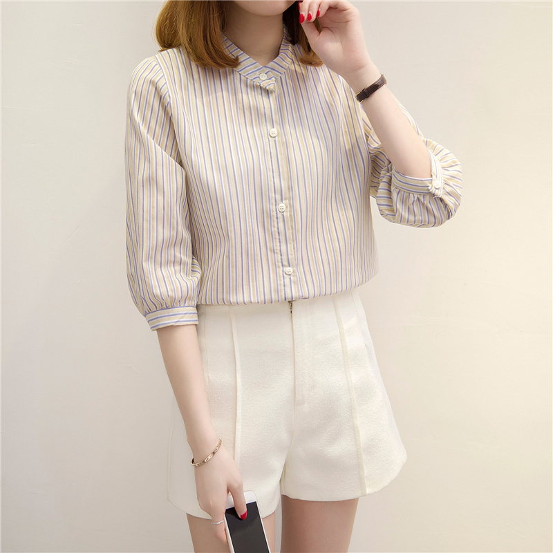 夏裝新款女裝條紋襯衫女小清新上衣半袖韓范寬松bf風襯衣女夏