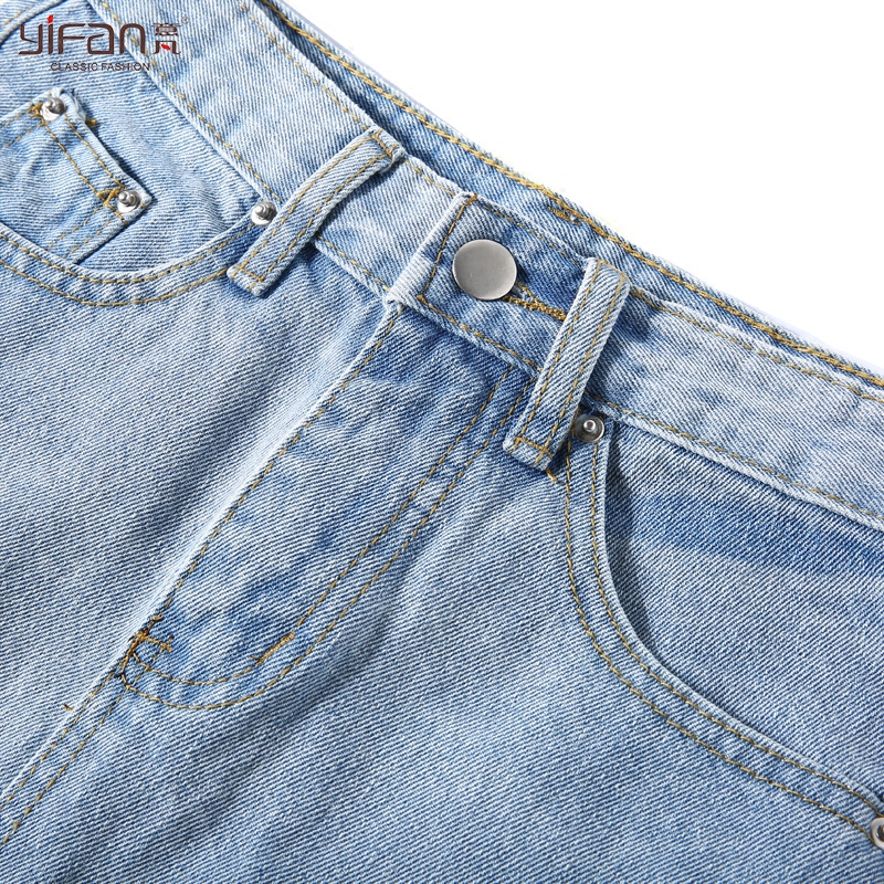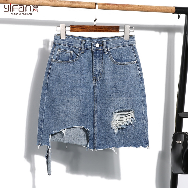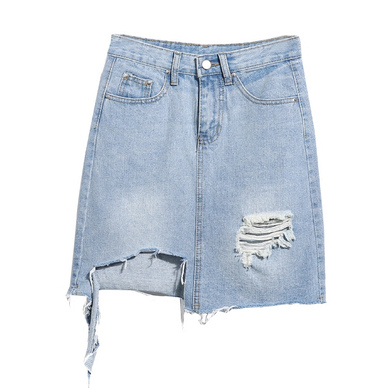 夏季新款個性百搭高腰牛仔裙破洞包臀裙不規則做舊磨白半身裙短裙