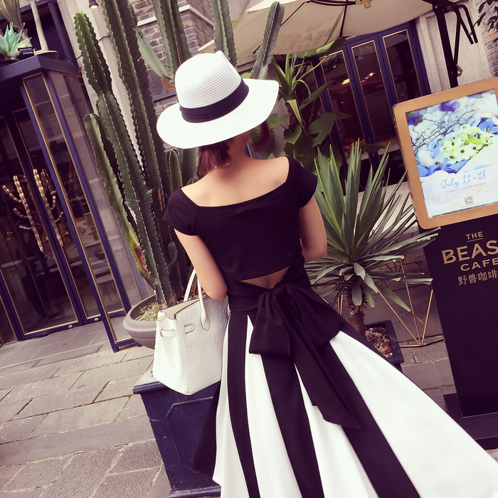 2017款連衣裙女夏兩件套韓版黑白條紋高腰修身顯瘦中長款裙休閑潮