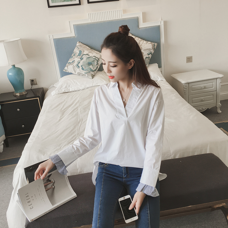 春款女裝喇叭袖拼接條紋襯衫女韓范長袖雪紡百搭襯衣v領上衣
