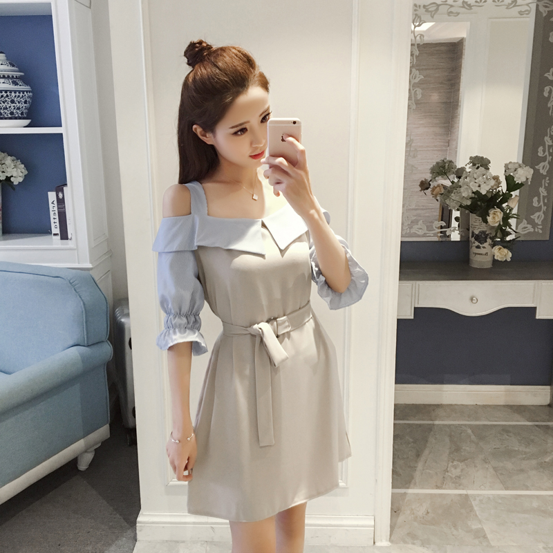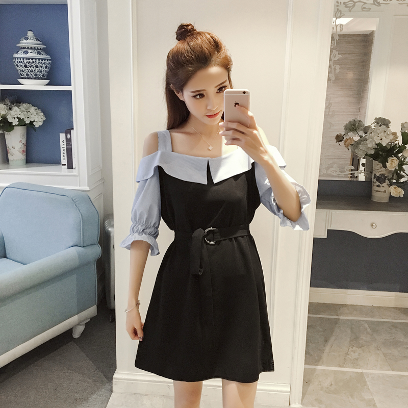 春夏季新款女裝韓版一字領拼色喇叭袖修身露肩吊帶中袖連衣裙