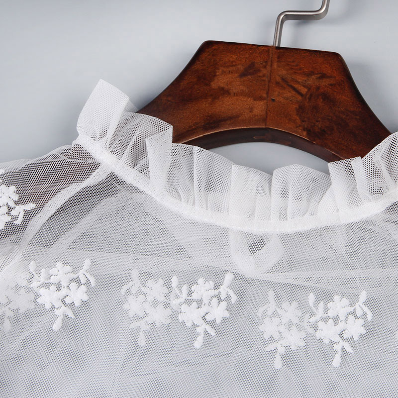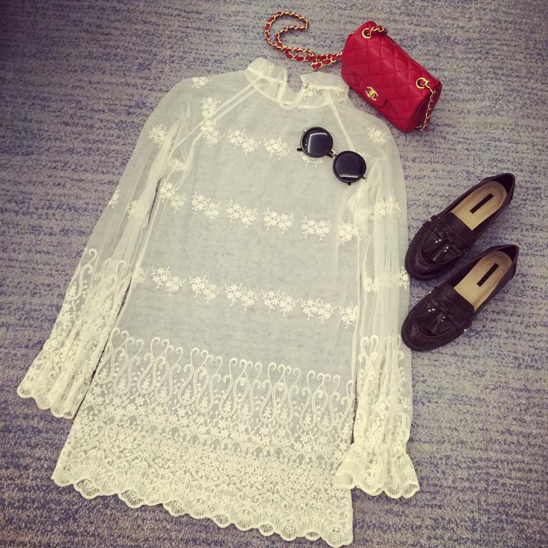 紗網蕾絲打底衫女長袖2017春夏新款潮韓版中長款鏤空透視立領上衣