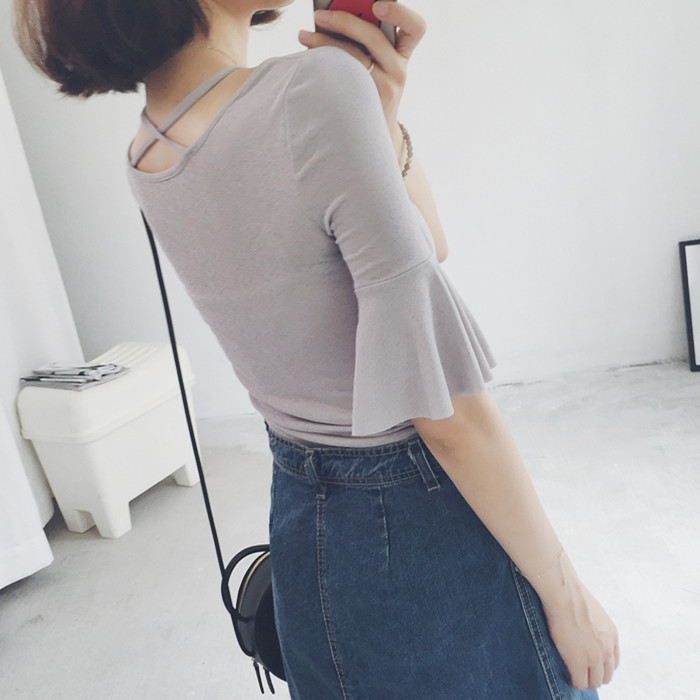 夏季韓版新款純色百搭修身顯瘦喇叭袖低領性感上衣短袖T恤女