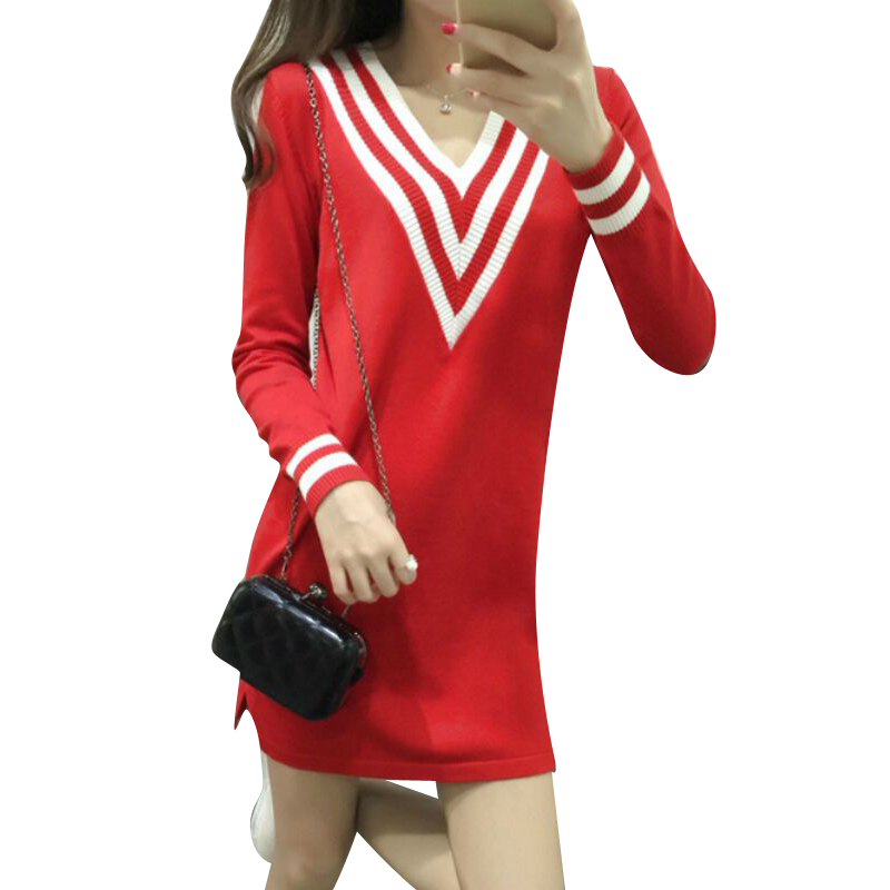 春秋裝新款韓版中長款拼接條紋V領長袖打底衫針織衫連衣裙女