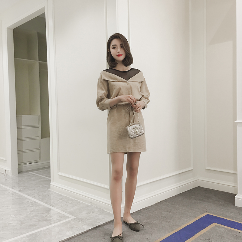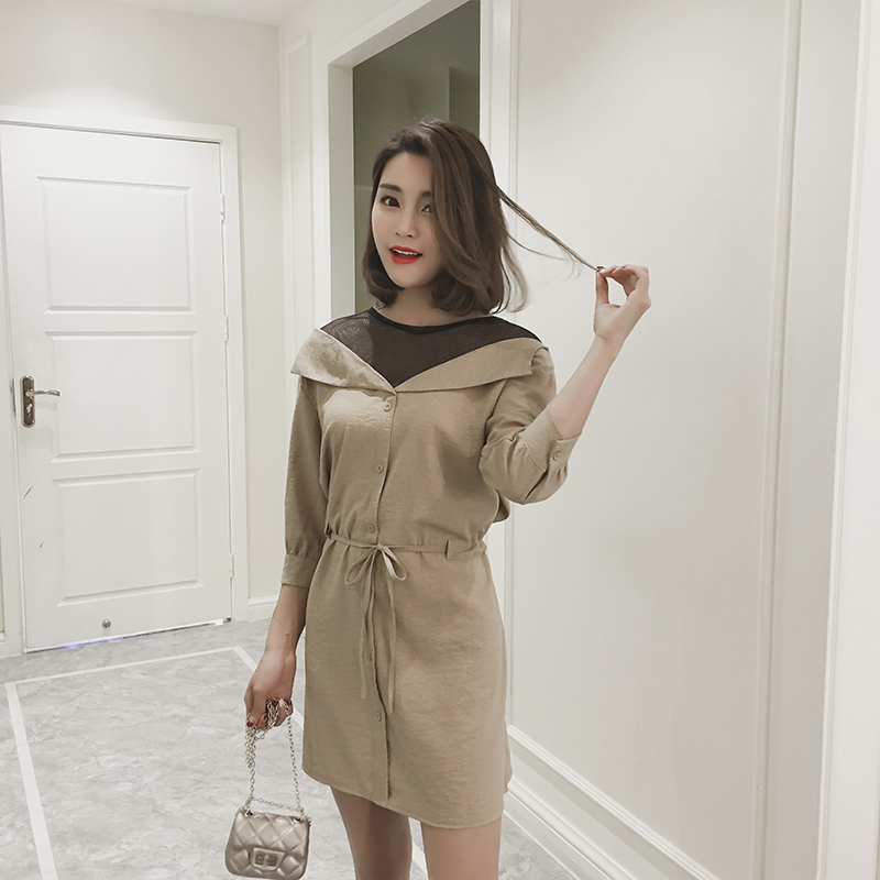 【ps:網紗領口假兩件,腰部抽繩連衣裙 無里襯設計】