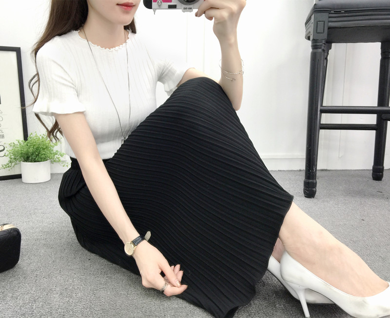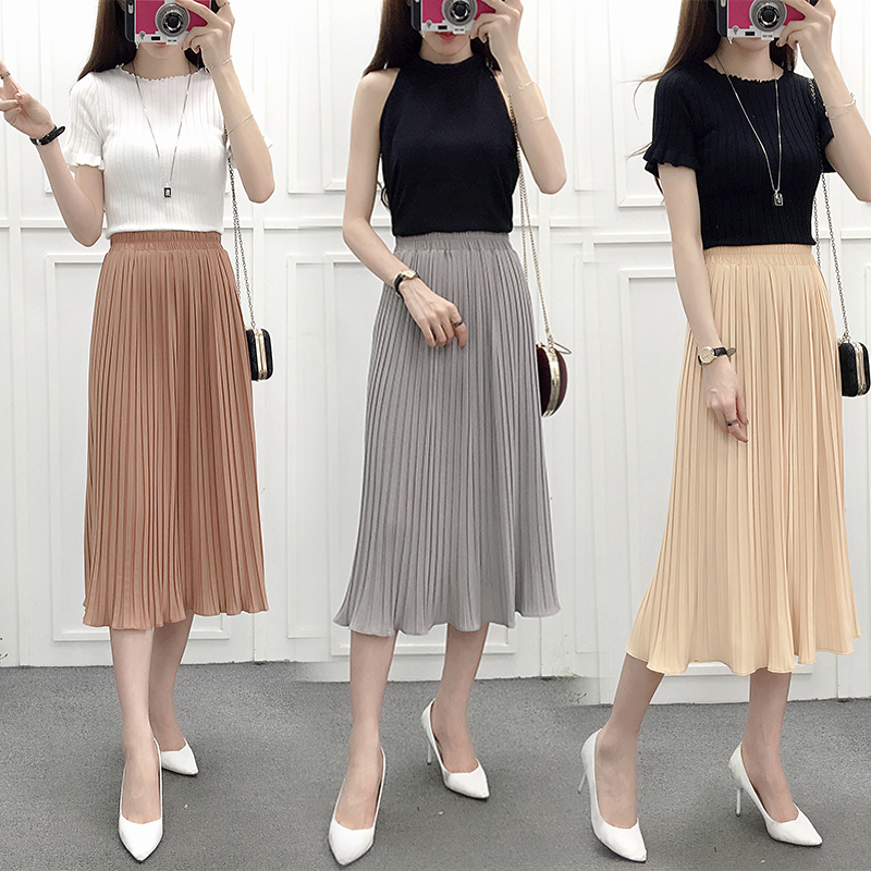 韓版夏季高腰中長款百褶裙半身裙女荷葉邊松緊腰雪紡裙A字裙長裙