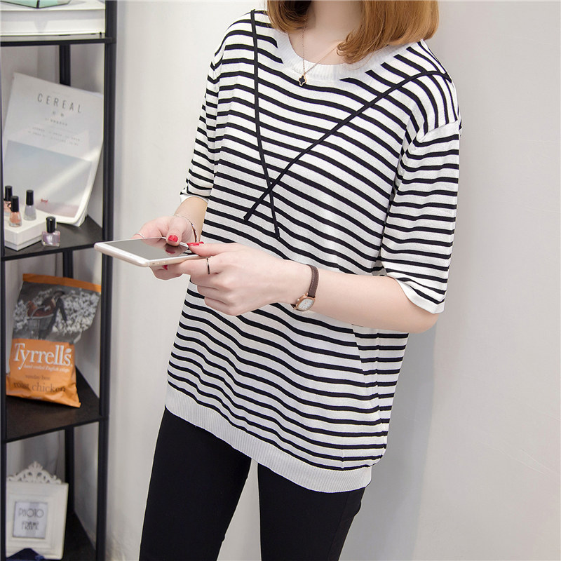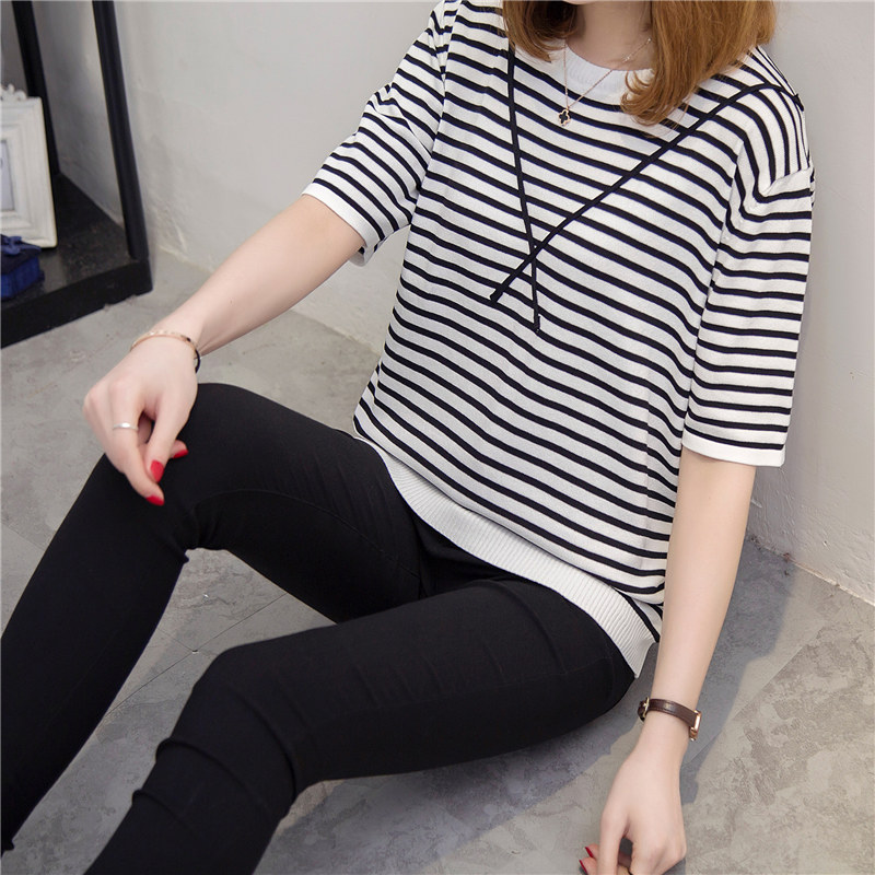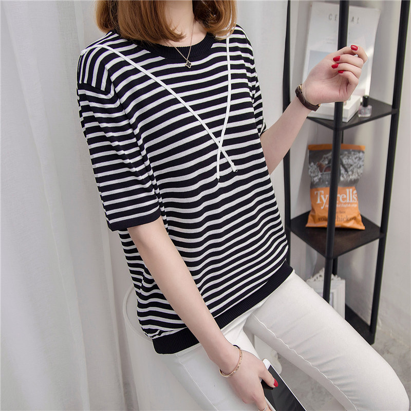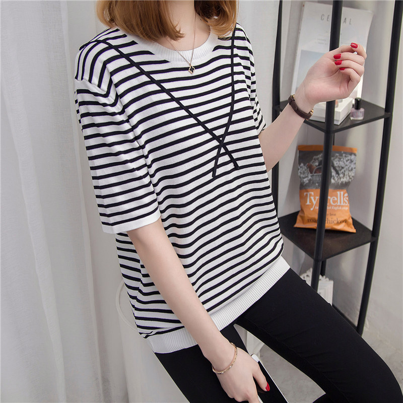 條紋針織衫女上衣寬松套頭薄款短袖針織打底衫春季女裝新款潮