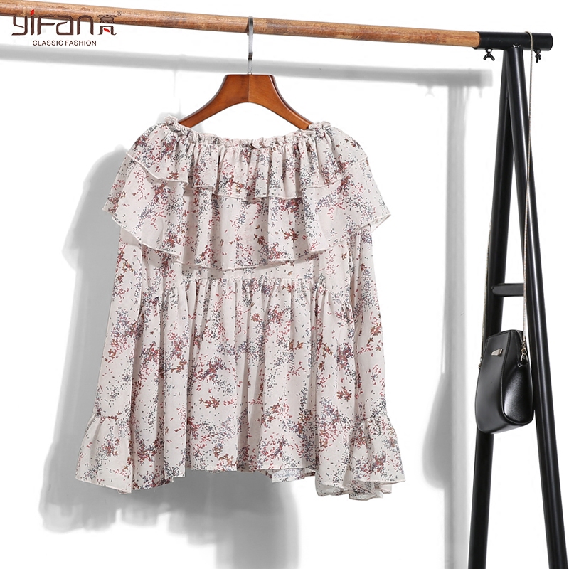 韓國春夏新款荷葉邊喇叭袖印花雪紡襯衫上衣寬松套頭碎花雪紡衫女