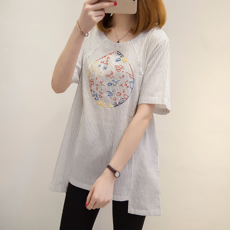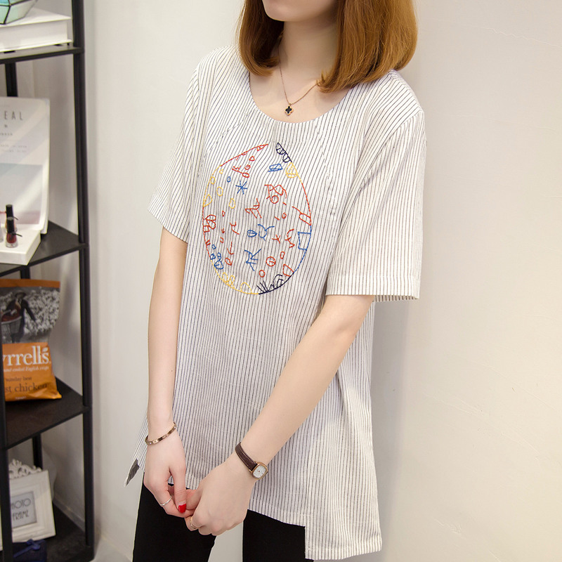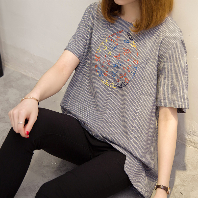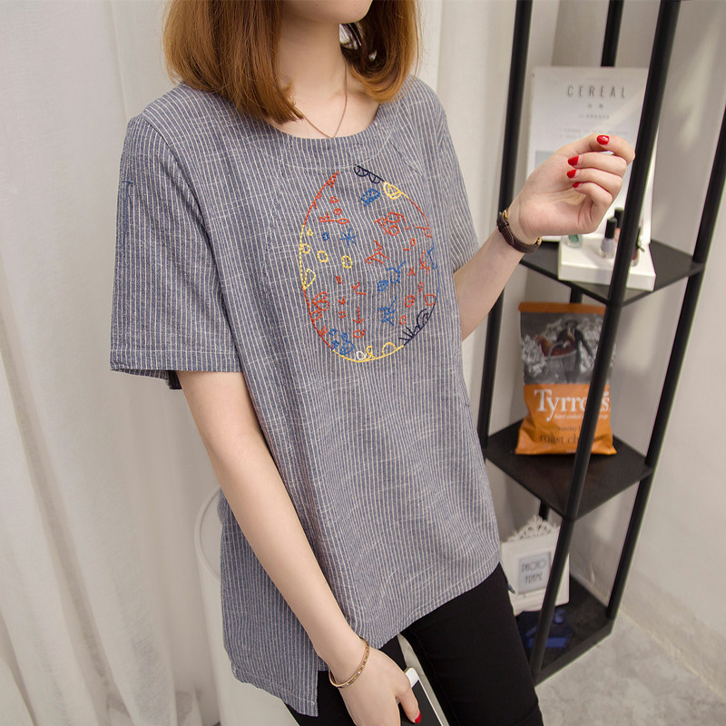 短袖t恤女寬松條紋體恤衫韓版百搭休閑刺繡上衣女夏裝新款女