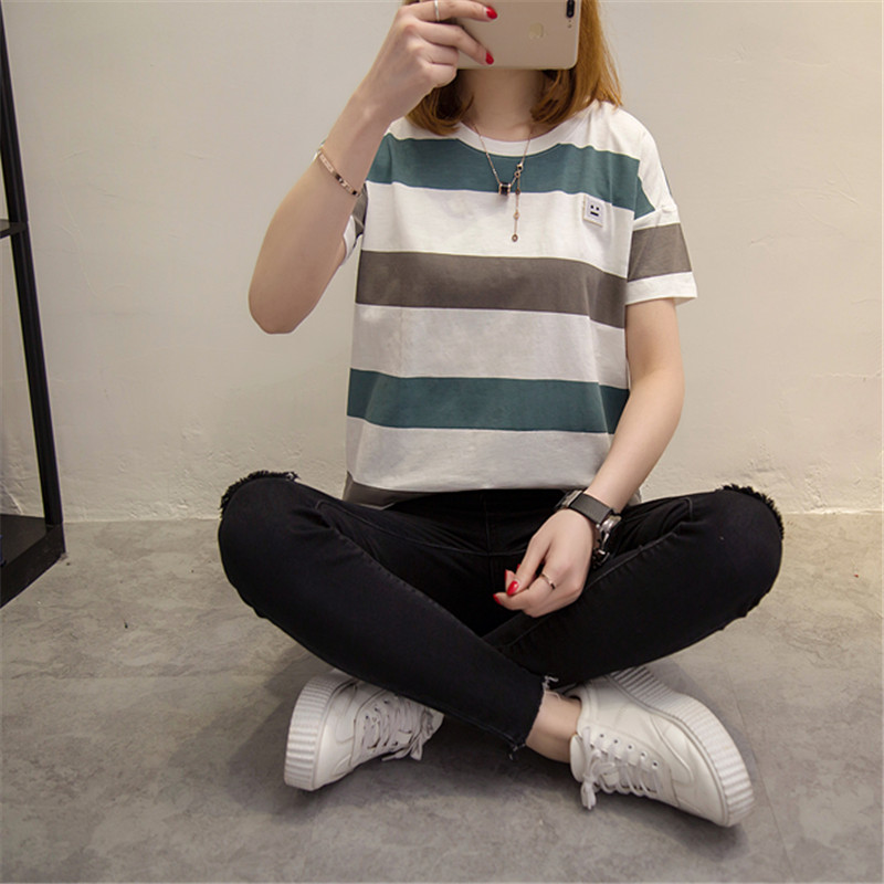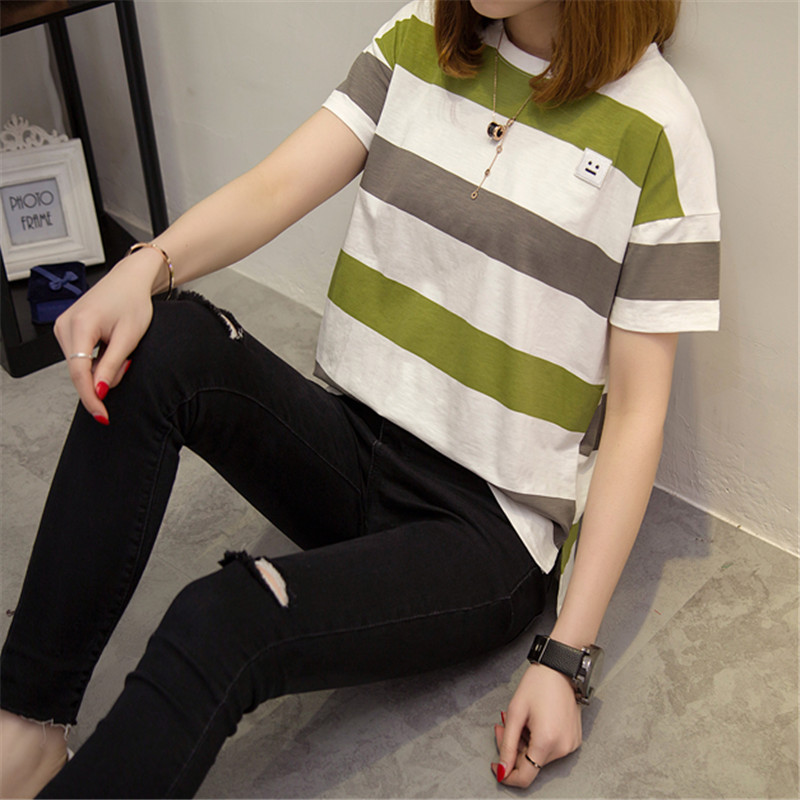 女裝春裝新款女裝短袖t恤女條紋卡通學生韓版寬松顯瘦打底衫