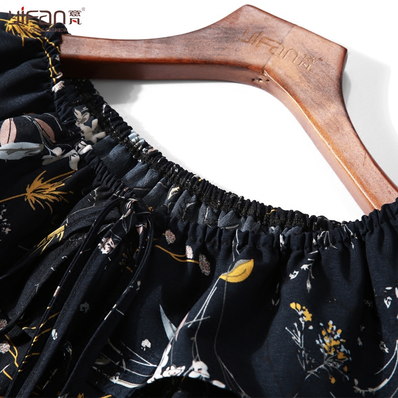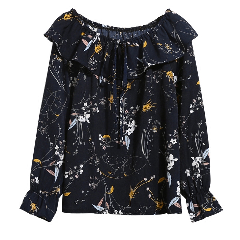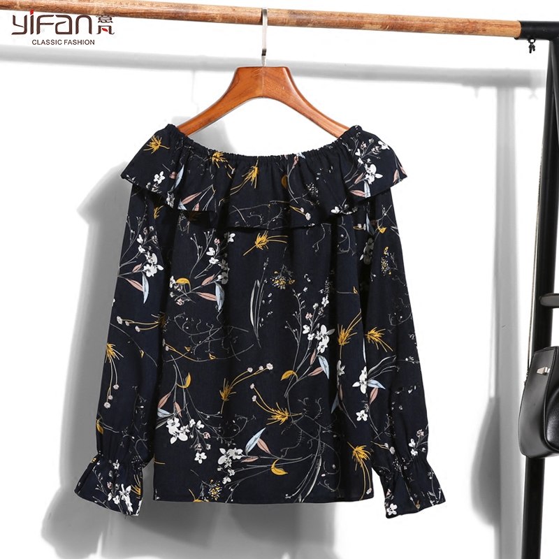 春夏季新款韓版復古一字領露肩寬松荷葉邊喇叭袖碎花雪紡衫女上衣