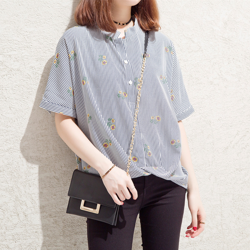 夏裝新款女裝港味條紋襯衫女短袖甜美chic上衣小清新韓范寬松