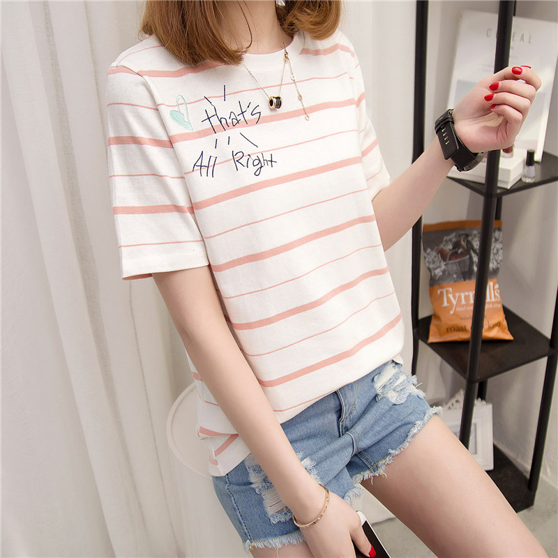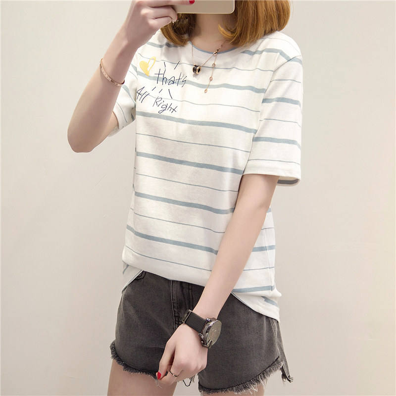 條紋短袖t恤女寬松顯瘦上衣打底衫女學生百搭春季時尚新款潮