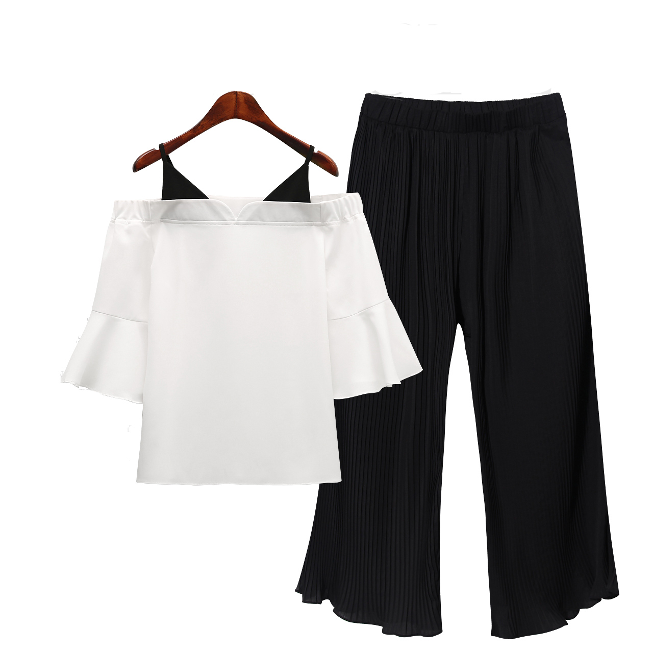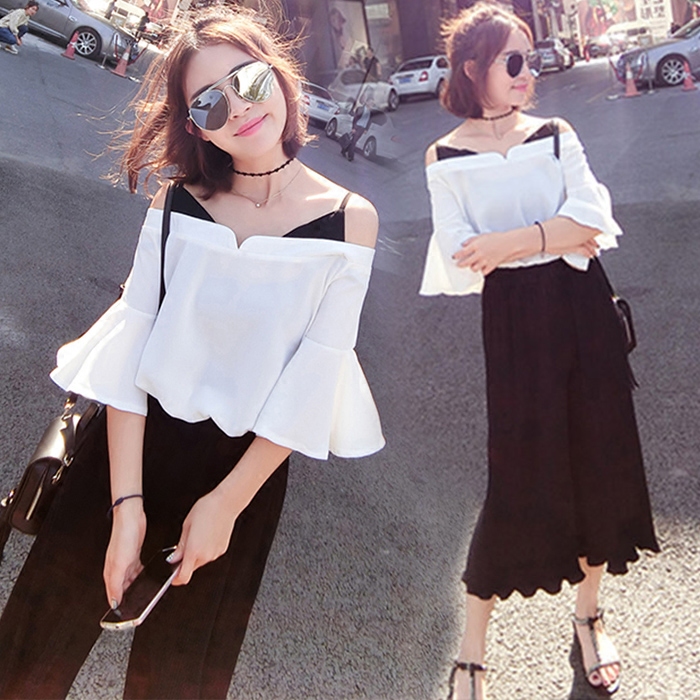 春裝新款韓版一字領闊腿褲兩件套名媛氣質小香風時尚套裝女潮