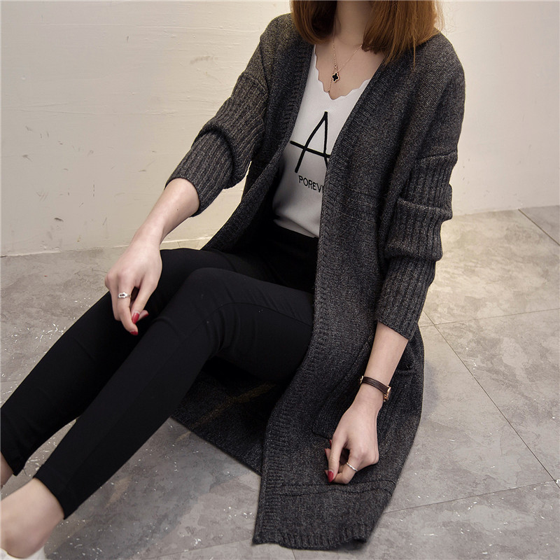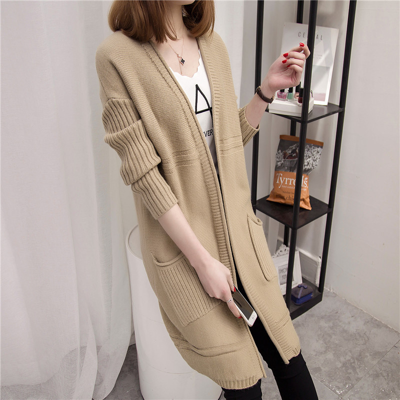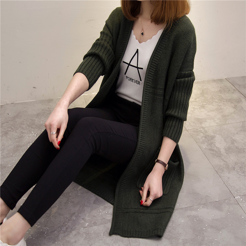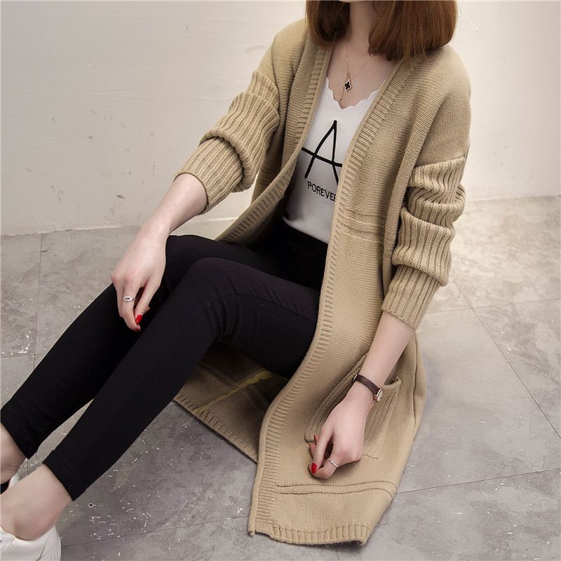 中長款春秋季新款女裝韓版針織衫開衫寬松百搭毛衣外套口袋潮
